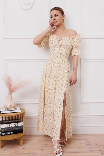Платье женское выполнено их сочетания плательной ткани и блузочного хлопка, изделие полуприлегающего кроя ассиметричное, горловина- округлая, рукав приспущенный втачной, длинный, с манжетой по низу. Спинка разрезная с застежкой петли-пуговицы. Низ изделия ассиметричный, с небольшим разрезом по переду
