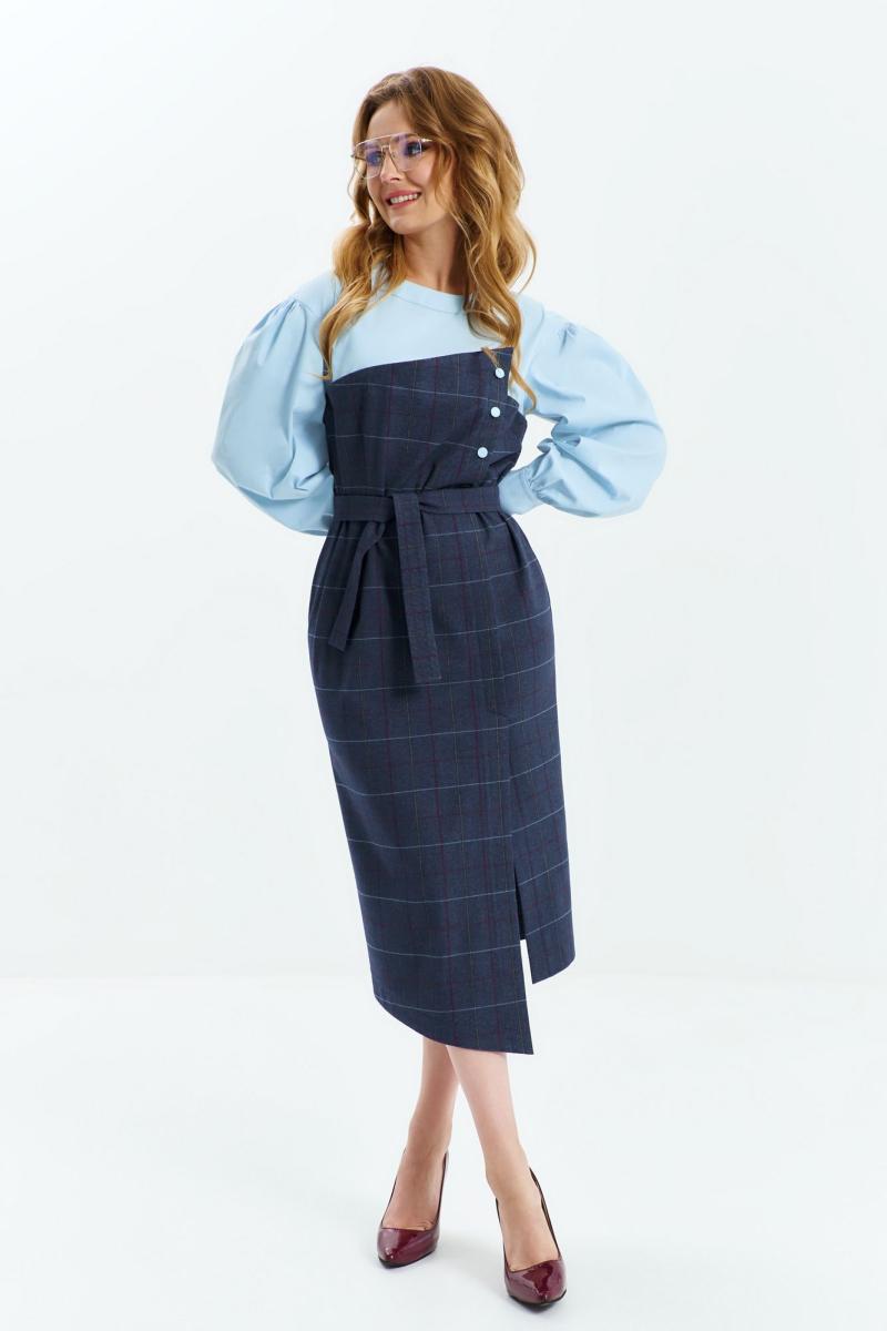 Платье женское выполнено их сочетания плательной ткани и блузочного хлопка, изделие полуприлегающего кроя ассиметричное, горловина- округлая, рукав приспущенный втачной, длинный, с манжетой по низу. Спинка разрезная с застежкой петли-пуговицы. Низ изделия ассиметричный, с небольшим разрезом по переду