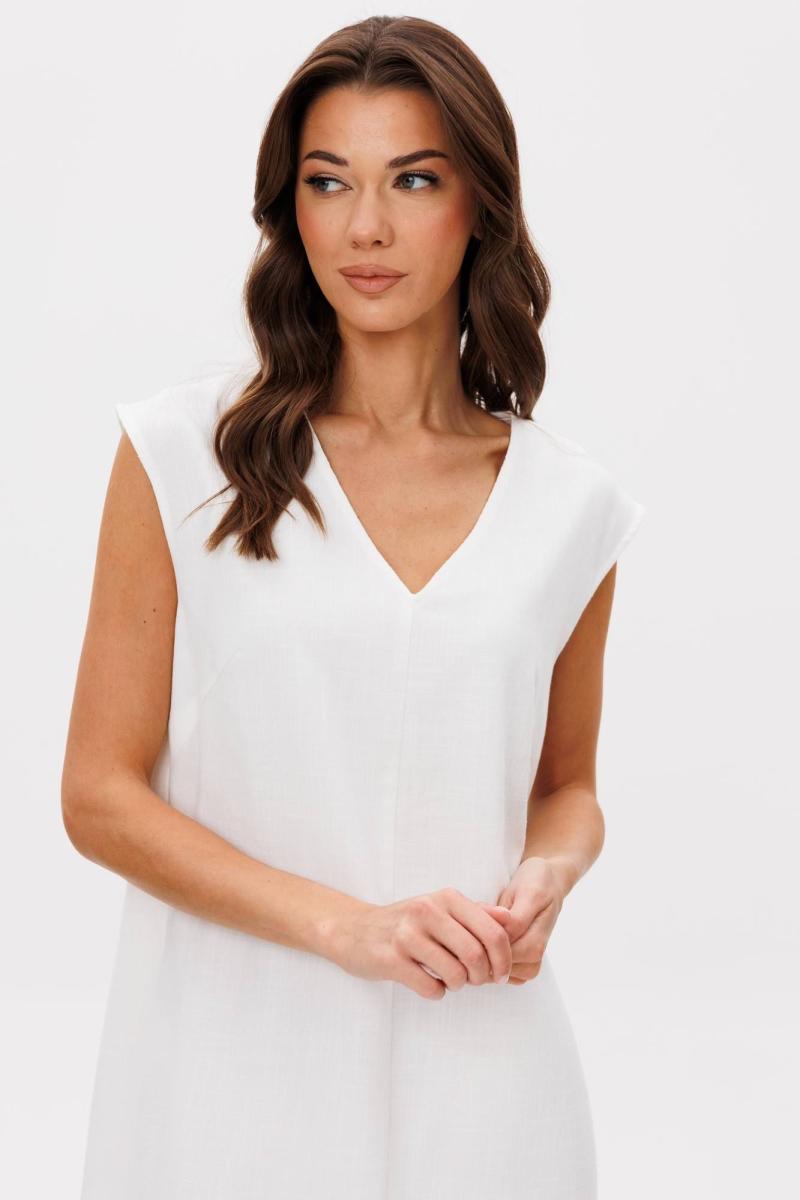 Один из качественных и загадочных материалов для женской одежды является лён. Его отличает структура. которая выглядит стильно, строго и элегантно одновременно. А платье из льна - это идеальный выбор для летнего гардероба, особенно когда оно в изысканном белом цвете. Свободный упрямлённый силуэт, V-образная горловина, слегка заниженная линия плеча. Лаконичность и неповторимость модели в оригинальной линии низа. Длина изделия около 110 см.