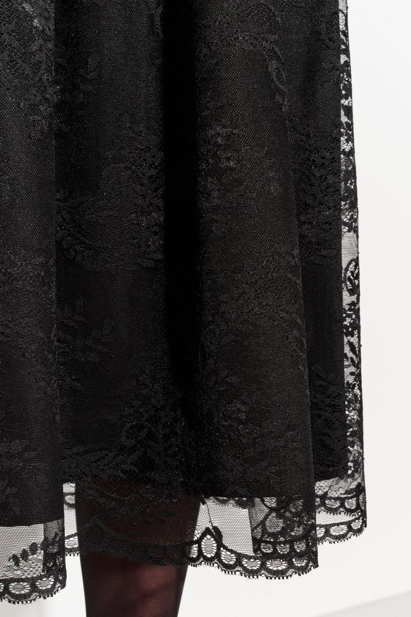 Женское нарядное платье А- силуэта. Верхняя часть изделия выполнена из плательной ткани, нижняя часть - из французского кружева на подкладке из крепа. На линии талии, спинке и по переду платья находятся складки с настрочным (не съемным) функциональным поясом, который застегивается на петли и пуговицы, регулируя линию талии. По спинке застежка на петлю и пуговицу. Платье полностью соответсвует заявленному размеру.