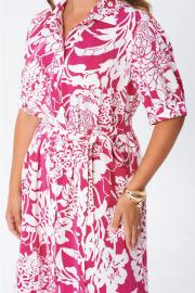 Платье А-образного силуэта выполнено из вискозной ткани с летним принтом. Платье с рубашечным воротником и центральной застежкой на петли и пуговиц. Перед с нагрудной вытачкой. Рукав втачной одношовный с притачной манжетой на петлю и пуговицу. По линии притачивания - сборка. По низу платья притачан волан со сборкой. К платью прилагается съемный пояс из основной ткани. Длина платья по спинке- 127 см, длина рукава- 29 см.