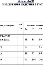 Платье с застежкой на потайную молнию в среднем шве спинки, без воротника, с круглым вырезом горловины. Платье отрезное по линии талии. Лиф переда и спинки с рельфами, выходящими из плеча. По правому рельефу переда и спинки- волан. Нижняя часть платья с двумя рельефами. Нижняя часть спинки со средним швом, двумя рельефами. Платье без рукавов.
