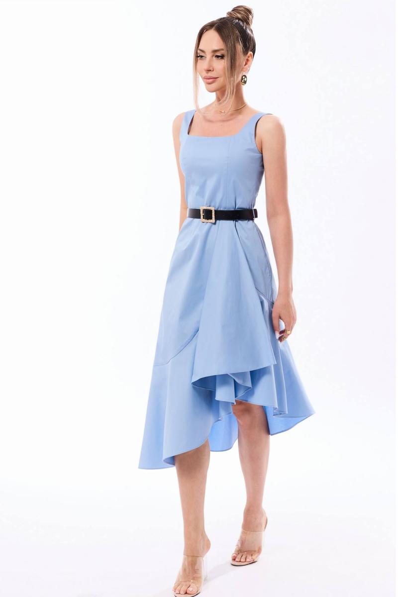 платье без воротника, без рукавов, с фигурным вырезом горловины, с застежкой на потайную молнию в среднем шве спинки. Платье отрезное по линии талии. По лифу переда с рельефами, выходящими из горловины. Спинка со средним швом, по лифу спинки с рельефами, выходящими из горловины. Нижняя часть платья с отрезным фигурным воланом, закрепленным в виде складки по талиевому шву. Платье со съемным поясом.