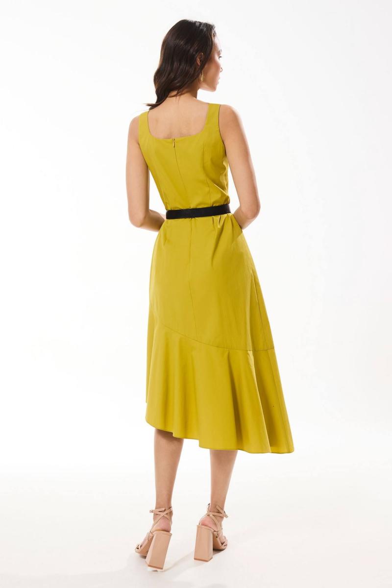 платье без воротника, без рукавов, с фигурным вырезом горловины, с застежкой на потайную молнию в среднем шве спинки. Платье отрезное по линии талии. По лифу переда с рельефами, выходящими из горловины. Спинка со средним швом, по лифу спинки с рельефами, выходящими из горловины. Нижняя часть платья с отрезным фигурным воланом, закрепленным в виде складки по талиевому шву. Платье со съемным поясом.