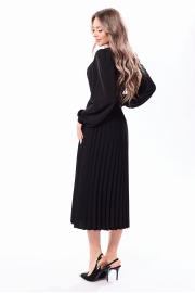Платье, с центральной застежкой на петли и пуговицы, отрезной стойкой, круглым вырезом горловины. Платье отрезное по линии талии. Шов по талии присборен на резинку. Лиф переда разделен линиями вертикального сечения на три детали. В швы стачивания деталей переда втачивается кружево в тон ткани. Нижняя часть платья гофрирована. Рукав втачной, длинный, со сборкой по окату и отрезной манжетой. Шов притачивания к манжете присборен. Платье со съемным поясом. нижняя часть платья на подкладке