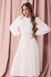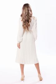 Платье, с центральной застежкой на петли и пуговицы, отрезной стойкой, круглым вырезом горловины. Платье отрезное по линии талии. Шов по талии присборен на резинку. Лиф переда разделен линиями вертикального сечения на три детали. В швы стачивания деталей переда втачивается кружево в тон ткани. Нижняя часть платья гофрирована. Рукав втачной, длинный, со сборкой по окату и отрезной манжетой. Шов притачивания к манжете присборен. Платье со съемным поясом. нижняя часть платья на подкладке
