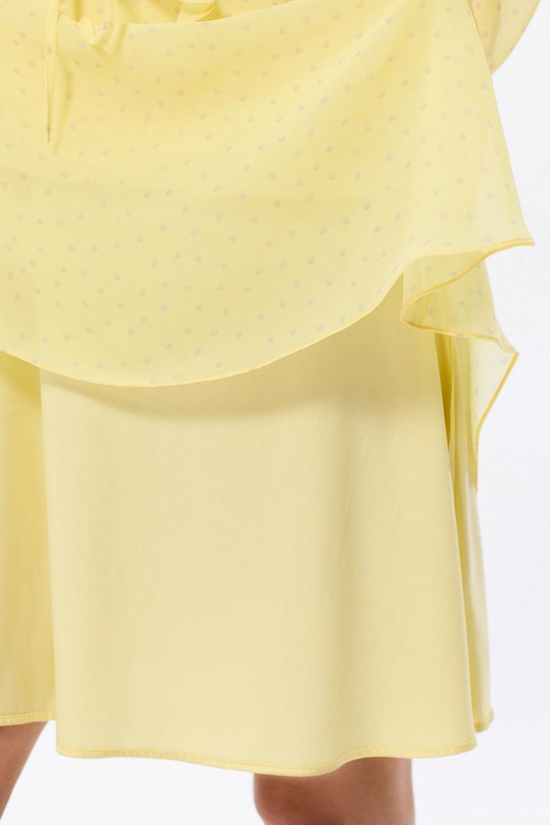 Платье с застежкой на потайную молнию в среднем шве спинки, без воротника, с V-образным вырезом горловины. По переду с нагрудными вытачками. Платье отрезное по линии талии. Шов по талии с воланом. Спинка со средним швом, талиевыми вытачками по верхней части спинки. По горловине переда- шнур- завязка. Рукав втачной, длинный. Окат рукава со сборкой. Низ рукава присборен на резинку. Платье на подкладке.