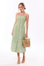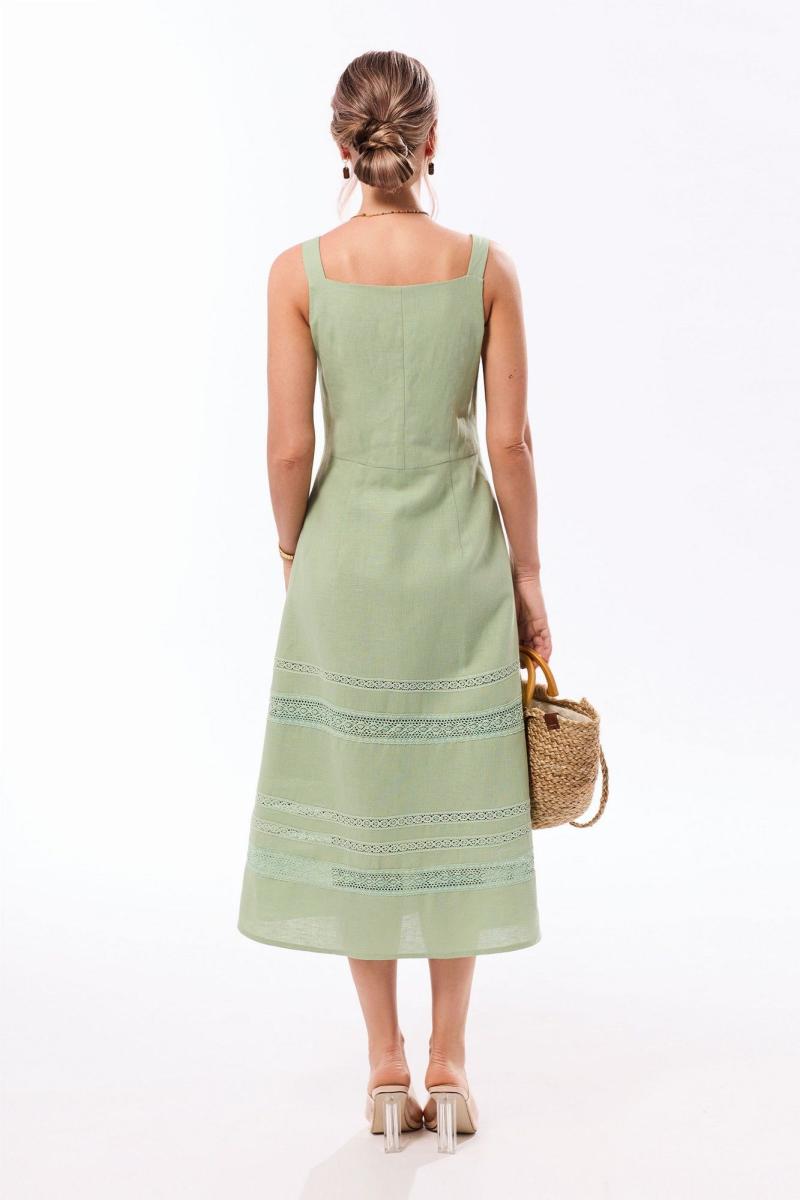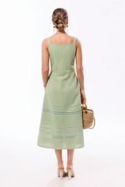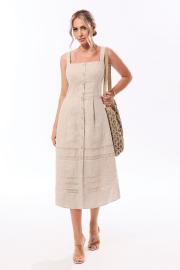 Платье с центральной застежкой на петли и пуговицы, без воротника, без рукавов, на бретелях. Платье отрезное по линии талии. Лиф переда с нагрудными и талиевыми вытачками. Лиф спинки со средним швом, талиевыми вытачками. Нижняя часть переда и спинки расширенная к низу, с двумя односторонними складками по переду и талиевыми вытачками по низу. По нижней части платья вставки из кружева разной ширины. Платье на подкладке