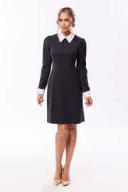 Платье с застежкой на потайную молнию в среднем шве спинки, с круглым вырезом горловины,со съемным воротником. По переду с рельефами, выходящими из проймы. Платье отрезное по линии талии. Нижняя часть переда и спинки расширенная к низу. По нижней части переда два рельефа, левый рельеф заканчивается разрезом. Нижняя часть спинки со средним швом, двумя рельефами. Рукав втачной, длинный, со съемными манжетами. Силуэт: полуприлегающий