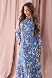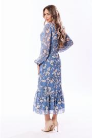 Платье без воротника, с круглым вырезом горловины, с застежкой на потайную молнию в среднем шве спинки. Платье отрезное по линии талии. По лифу переда с нагрудными и талиевыми вытачками. Спинка со средним швом, по лифу спинки с талиевыми вытачками. Нижняя часть платья расширенная к низу. По низу платья- волан. Рукав втачной, длинный, с отрезной манжетой. Шов притачивания манжеты и окат рукава присборены.