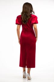 Платье без воротника, с круглым вырезом горловины, центральной застежкой на петли и пуговицы по лифу переда. Платье отрезное по линии талии. По лифу переда с нагрудными вытачками. Спинка со средним швом, заканчивающимся разрезом, талиевыми вытачками. Рукав втачной, короткий, по низу, присборен на резинку. Окат рукава присборен. Цветовая гамма для верха, подкладки, фурнитуры, отделки: платье из ткани в одной цветовой гамме. платье на подкладке