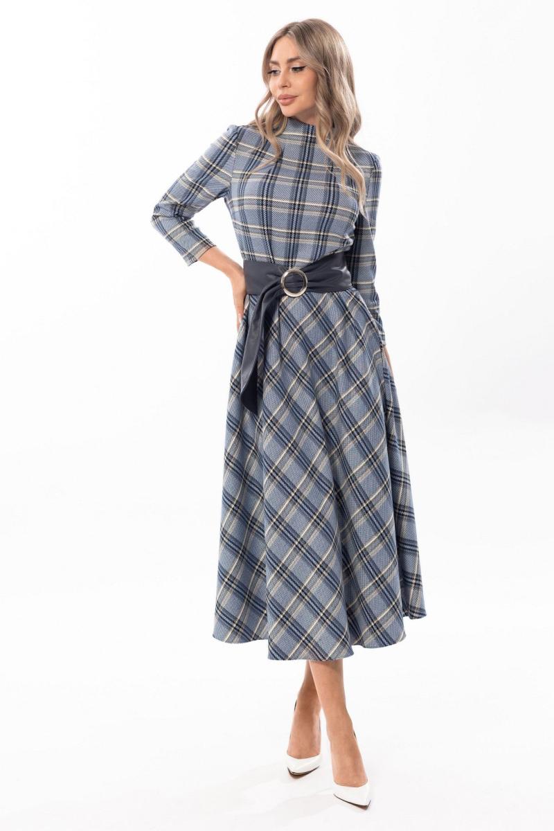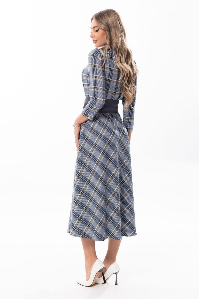 Платье с центральной застежкой на потайную молнию в среднем шве спинки, цельнокроенной стойкой с вытачками. Платье отрезное по линии талии. Верхняя часть переда с нагрудными вытачками. Верхняя часть спинки со средним швом. В боковых швах расположены карманы. Платье со съемным поясом. Платье без подкладки.