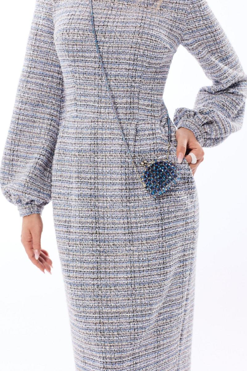 Платье, с застежкой на потайную молнию в среднем шве спинки, без воротника, с круглым вырезом горловины. Платье отрезное по линии талии. Лиф переда с талиевыми и нагрудными вытачками. Нижняя часть переда с двумя встречными складками, выходящими из талиевого шва, карманами от талиевого шва до бокового. Спинка со средним швом, заканчивающимся шлицей, талиевыми и нагрудными вытачками. Рукав втачной, длинный, с отрезной манжетой, застегивающейся на одну петлю и пуговицу. Низ рукава присборен.