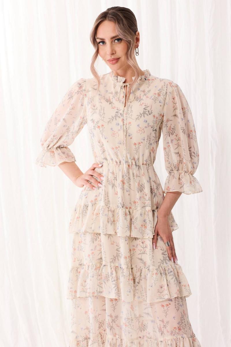 Платье без застёжки. Платье отрезное по линии талии. Верхняя часть переда с нагрудными вытачками. По горловине стойка- рюша с завязкой. Верхняя часть спинки со сборкой по шву притачивания стойки. Шов по талии присборен резинкой. Юбка с двумя сечениями, в которые вставлены присборенные рюши. Рукав втачной, длинный, присборенный на резинку. По окату рукава -сборка. Платье на подкладке.