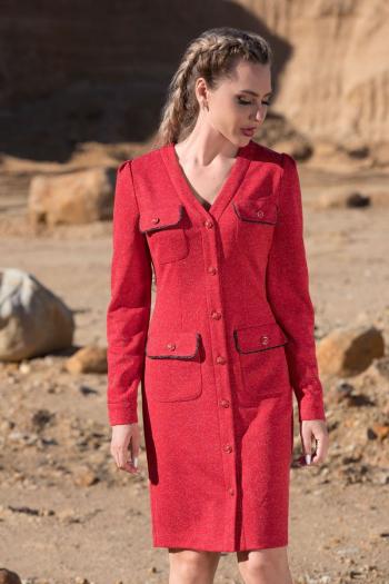 Платье женское А-силуэта, изготовлено из натуральной ткани. Горловина V-образной формы. По переду нагрудные вытачки, средний шов с разрезом внизу. На полочке выполнена дизайнерская вышивка. Спинка со средним швом. Рукава втачные.