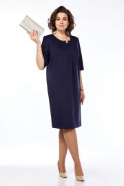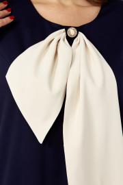 Платье женское, нарядное, прямого силуэта, выполнено из трикотажного полотна. Горловина округлой формы. По центру переда обработана складка-перемычка для съемного декоративного элемента, из отделочной ткани. Имеются нагрудные вытачки. Спинка цельнокроенная. Рукава втачные, одношовные.