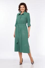 Платье женское, А-силуэта выполнено из плательной ткани. Воротник рубашечного типа, застежка центральная, фигурная планка на петли и пуговицы. Перед с нагрудными вытачками и ассиметричным клапаном в области груди. Спинка со средним швом. Рукава втачные со складками и притачной манжетой. Пояс выполнен из основной ткани с пряжкой. Платье декорировано дизайнерской вышивкой.