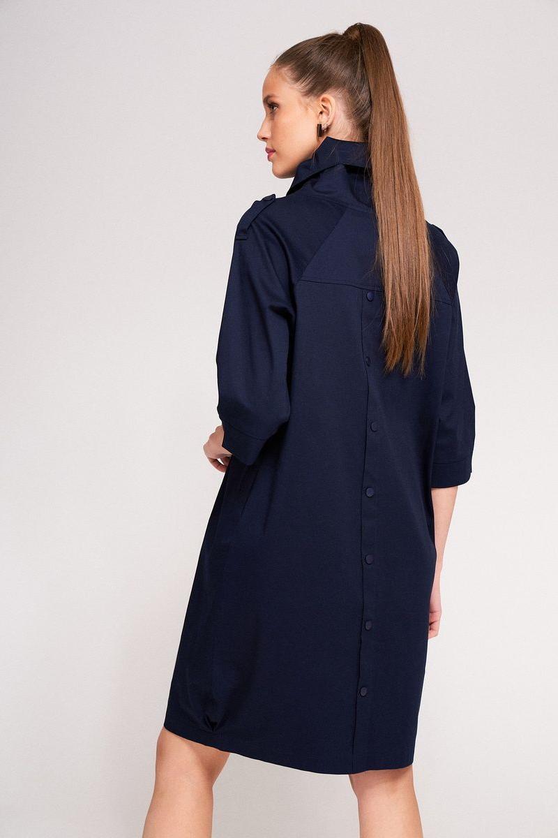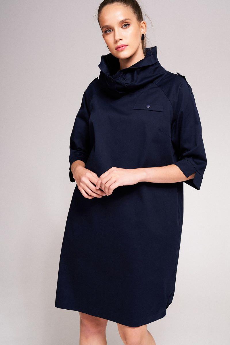 Платье женское свободного кроя, прямого силуэта. Рукава реглан, проходящие в середину горловины. По переду платья с левой стороны имеется имитация кармана с листочкой. По спинке находятся застежка-планка на кнопки-пуговицы. Платье с воротником стойкой с застежкой на кнопку. Длина изделия - 93 см. Длина рукава - 48 см