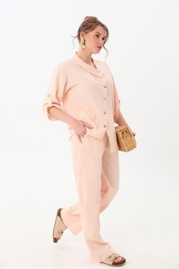 Платье женское свободного силуэта, отрезное по линии талии. Перед лифа с притачной планкой, которая застегивается на петли и пуговицы. Юбка платья имеет два яруса, которые собраны на сборку. Горловина обработана воротником – стойкой. Длина изделия в размерах 50-54 - 124 см, в размерах 56-60 - 127 см.