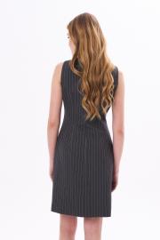 платье-сарафан мини полуприлегающего силуэта с вырезом каре по переду и сзади. Низ платья стремится к лёгкой трапеции. Застёжка на потайную молнию сбоку.