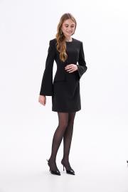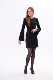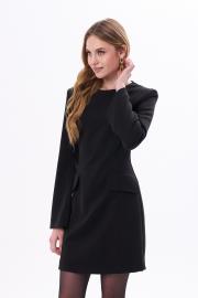 Платье длиной мини с длинным, слегка расклешённым рукавом прилегающее по талии с юбкой трапецией по форме. Линия плеча расширена за счёт плечевых накладок. По переду два декоративных, настрочных клапана. Застёжка на потайную молнию сзади. Платье выполнено из мягкой, трикотажной ткани.