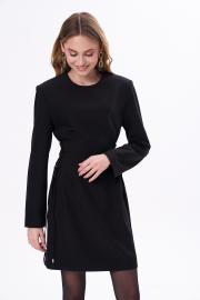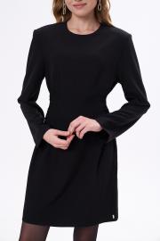 приталенное платье длиной мини с длинным рукавом и расширенной линией плеча за счёт плечевых накладок. По бокам шнуровка позволяющая регулировать прилегание. Застёжка на потайную молнию сзади