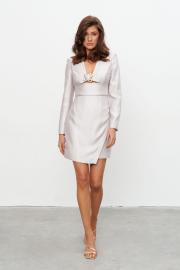 Платье мини из поливискозной ткани с матовым блеском. Платье прилегающего силуэта с длинным рукавом и плечевыми накладками. V-образный вырез плавно переходит в декоративную застёжку на металлическую пряжку. Под грудью небольшой вырез. Юбка асимметричного кроя с имитацией запаха. Застёжка на потайную молнию сзади. Длина по середине спинки 42-44р -86,5 см 48-50р -87см Длина рукава 42-44р -62 см 48-50р -62,5 см