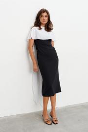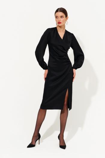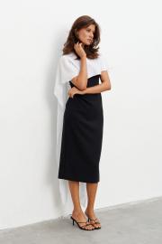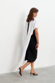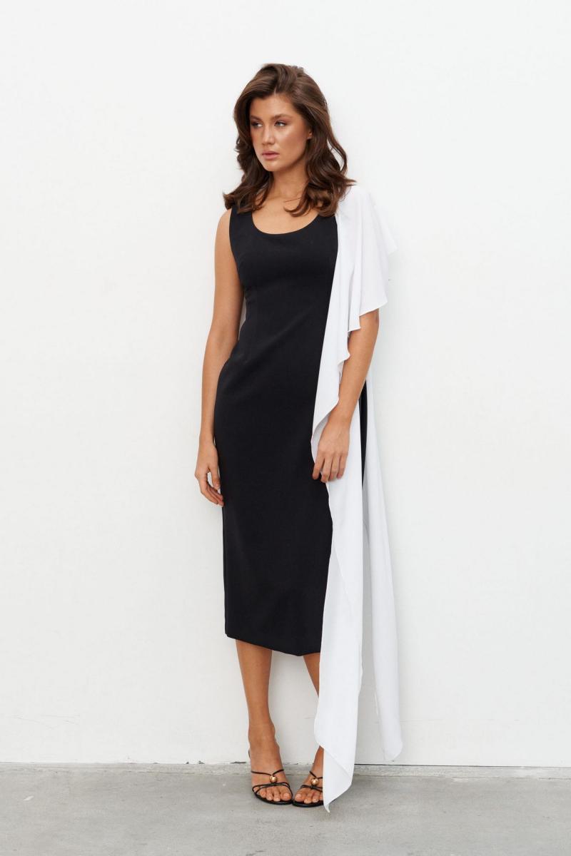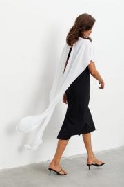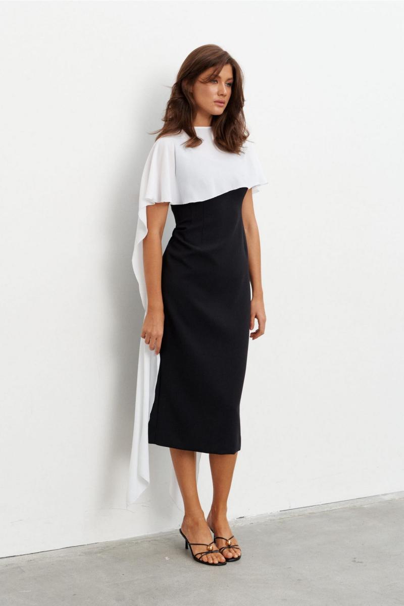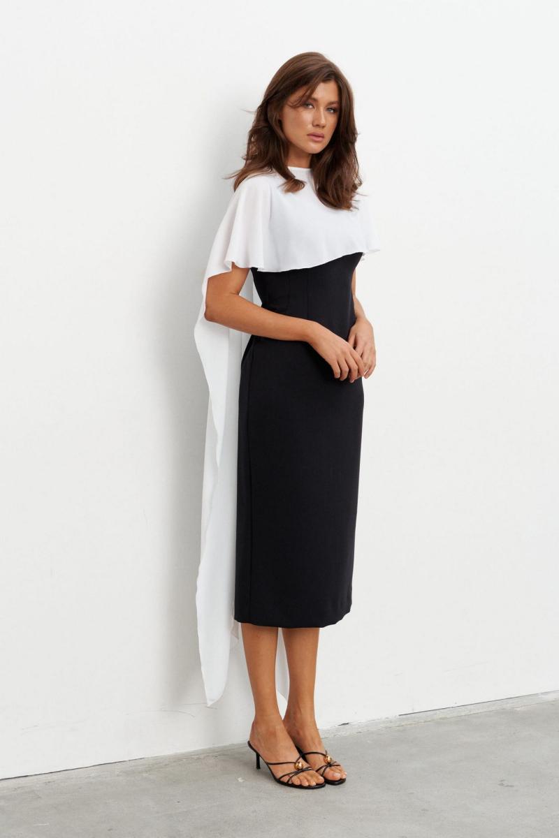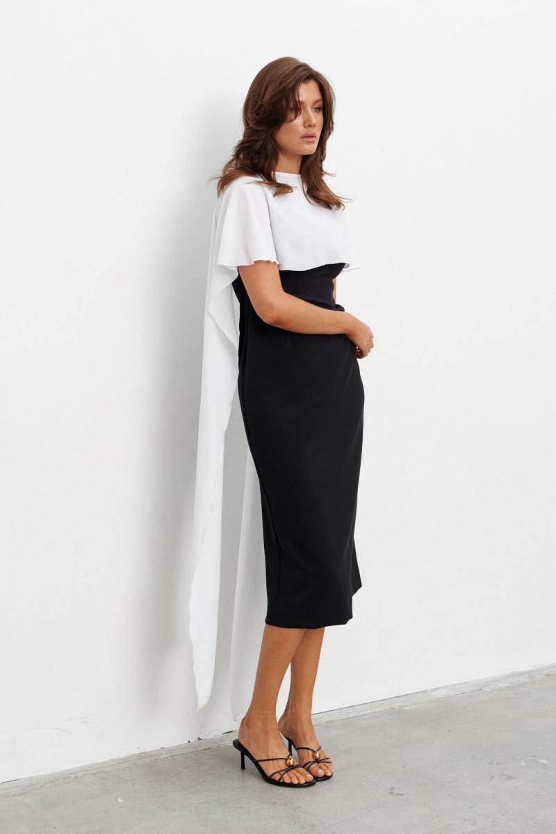 Комплект состоящий из плотного платья-футляра и струящейся, контрастной накидки. Платье прилегающего силуэта длиной миди. Вырез горловины - каре. Сзади шлица и застёжка на потайную молнию. Накидка создаёт эффект пелерины с застёжкой на пуговицу сзади. Длина по середине спинки - 105 см Длина накидки - 140 см
