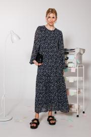 Принтованное легкое платье со сборкой в пол. Рукав на резинке, что позволит вам не чувствовать дискомфорт при носке. Платье выполнено из шифона с дизайнерским принтом "дражже" в синих тонах. На подкладке. Длина – 130 см.