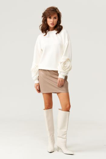 На полочке изделия расположены горизонтальные нагрудные вытачки, притачная вертикальная планка для застежки петли/пуговицы. Горловина обработана воротником рубашечного типа на стойке. Рукав втачной, одношовный, с притачной рюшей 13 см.
