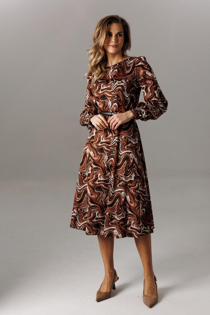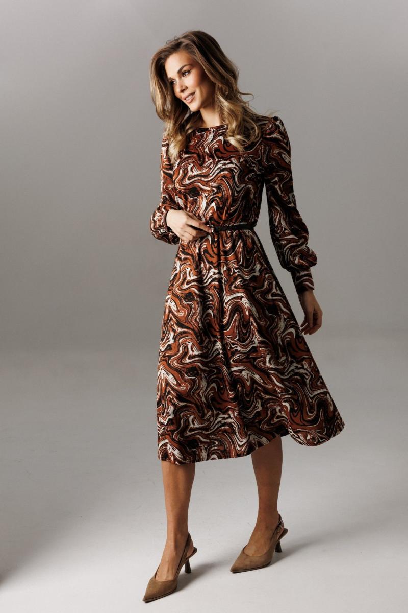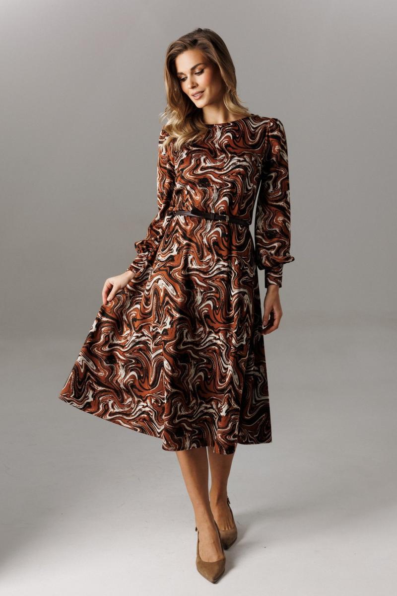Стильное платье из трикотажного полотна. Платье отрезное по линии талии, имеет нагрудные и талиевые вытачки. В среднем шве спинки расположена застежка-молния. Нижняя часть платья по крою «полусолнце». Рукав втачной, одношовный. По окату имеет сборку, у запястья присобран на притачной манжет, высотой 8 см, с застежкой петли-пуговицы. Длина рукава 65 см. Длина платья по спинке 112 см. К платью рекомендован ремень (в комплекте) для дополнительной фиксации талии, также служит декоративным элементом (фурнитура может отличаться от представленной на рекламном фотоматериале).