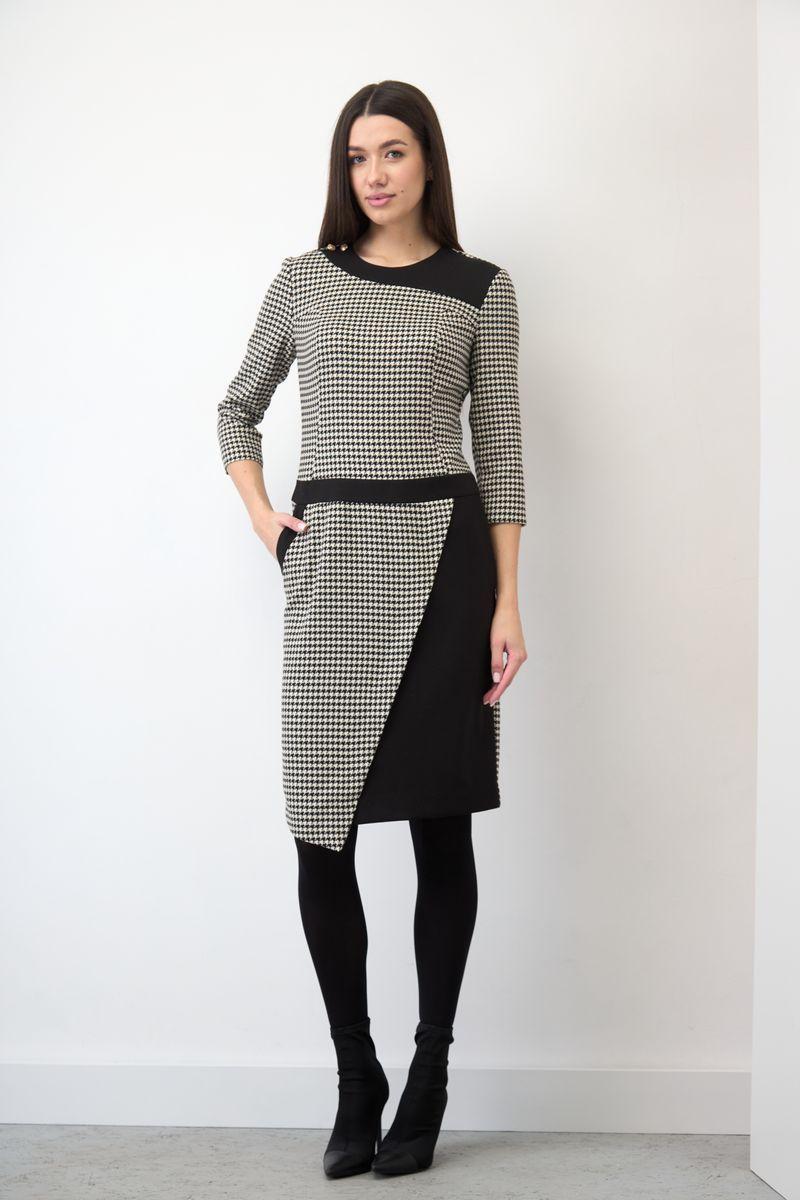 Платье полуприлегающего силуэта, с ассиметричной складкой-запахом по переднему полотнищу юбки. В правом боку юбки расположен внутренний косой карман, планка которого служит однотонным декоративным элементом, также как и фигурная кокетка у горловины, притачной горизонтальный пояс, расположенный на завышенной линии бедра и вторая передняя часть полотнища юбки. Платье имеет округлую горловину. Верхняя часть платья состоит из фигурной кокетки, на которой расположены 2 декоративных пуговицы ( * фурнитура может отличаться от представленной на рекламном фотоматериале), рельефных конструктивных бочков для прилегания и центральной части. На спинке изделия находятся талиевые вытачки, в среднем шве расположена застежка-молния и деликатный открытый разрез. Рукав прямой, втачной, длина 3/4. Длина изделия рукава в готовом виде 44 см. Длина изделия платья по спинке 99 см.