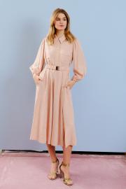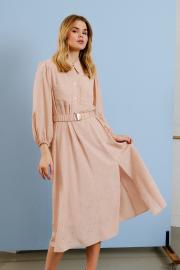 Платье миди-длины отрезное по линии талии. По линии груди накладные карманы. Рукав втачной длиной ¾, верхняя часть рукава на сборке, низ рукава присобран резинкой. Воротник рубашечного типа. Центральная застежка до линии талии на металлические кнопки. В боковых швах карманы. Сбоку платья выполнен разрез. Линия талии может регулироваться съемным поясом на резинке с металлической пряжкой. Длина по спинке от высшей точки горловины: 126 см Длина рукава: 55 см ОГ: 100-104-108 см (размер 44-46-48) ОТ: 96-100-104 см (размер 44-46-48) ОБ: 130-134-138-142 см (размер 44-46-48)