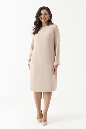 Платье А силуэта выполнено из экокожи, на подкладке. Рукав втачной короткий, округлый вырез горловины. По переду центральный шов и нагрудные вытачки. Застежка на потайную молнию в среднем шве спинки. Центральные, боковые швы и горловина декорированы металлическими зажимами. Длина по спинке от высшей точки горловины: 90 см Длина рукава: 22 см ОГ: 96-100-104-108 см (размер 44-46-48-50) ОТ: 106-110-114-118 см (размер 44-46-48-50)