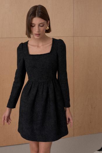 Платье полуприлегающего силуэта расширенное книзу из струящейся ткани. V-образный вырез горловины. Рукав втачной длиной 7/8 c разрезом по центру, по низу манжета. Платье отрезное на линии талии. По переду лифа талиевые вытачки. На спинке застежка на потайную молнию и талиевые вытачки. По центру переда шов переходящий в разрез по низу с декоративными пуговицами. В боковых швах функциональные карманы. Обращаем ваше внимание, что фурнитура может незначительно отличаться от фото.