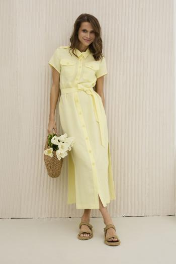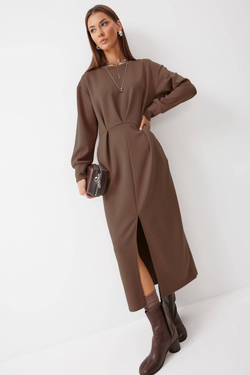 Платье полуприлегающего силуэта из трикотажного полотна. Горловина округлая. Рукав со спущенной линией плеча по низу манжета. Платье отрезное по линии талии. По переду на талии складки. В боковом шве функциональные карманы. В центральном шве юбки разрез. Длина платья 126см |