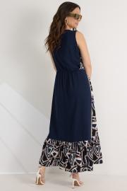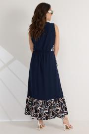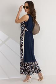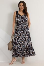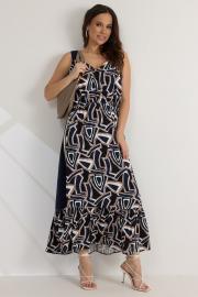 Легкое стильное платье свободного кроя с отрезной талией, дополненной эластичной тесьмой. Горловина с V-образным вырезом. Перед платья выполнен из цветного штапельного полотна, спинка выполнена из однотонного вискозного полотна. По боковым швам платье дополнено карманами. По низу платье дополнено притачным воланом. Длина платья от плечевого шва 138см.