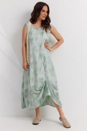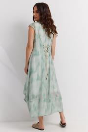 Двойное платье из натуральных тканей в потрясающей расцветке в технике TIE DYE. Верхнее платье из полупрозрачной воздушной ткани, нижнее платье из более плотной ткани в молочном оттенке. По низу для драпировки платье дополнено патой, что бы менять образ по вашему желанию. По спинке платье дополнено оригинальным элементом с регулировкой на декоративном шнурке по принципу корсета. Длина платья от плечевого шва 130 см.