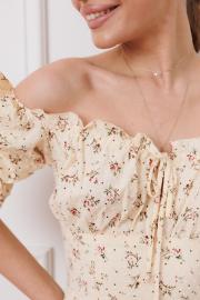 Платье отрезное по линии талии. Верхняя часть с отрезным лифом, подрез фигурный. По верхнему краю лифа кулиска, в которую вставленны завязки формирующие драпировку. В верхней части среднего шва спинки застежка на потайную молнию. Рукав длинный, объемный, на уровне выше локтя сборки выполненные посредством эластичных строчек ниткой и резинкой. Разрез по передней половине платья. Платье на хлопковой подкладке. Длинна юбки от талии-95 см.Длина рукава - 34 см. Длина по спине - 119-123 см