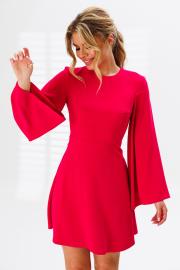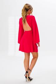 Платье «Фламинго» приталенного силуэта. Легкое платье малого объема, отрезное по талии, с нагрудными и талиевыми вытачками. Спинка украшена фигурным вырезом и открытой деталью на уровне талии. Горловина округлая, с застежкой на петлю и пуговицу сзади. Рукава длинные, втачные, с эффектным расширением к низу. В среднем шве спинки предусмотрена потайная молния. Длина платья — выше колена. Длина рукава - 58-62. Длина юбки - 50 см