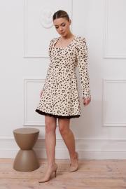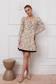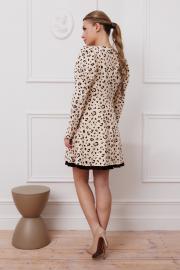 Элегантное платье приталенного силуэта, отрезное по талии. Подходит для всех типов фигур, сочетает комфорт и стиль. Фигурный вырез горловины, имитация застежки впереди, потайная молния сзади. Длина платья — 86 см, рукав (размеры 42-46) — 65 см.