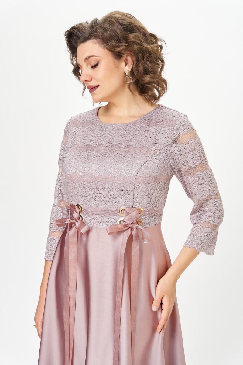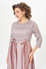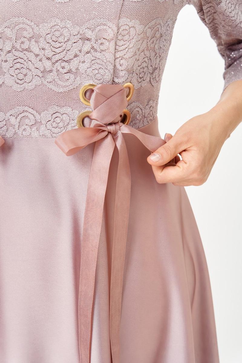Нарядное женское платье полуприлегающего силуэта, выполнено из гипюра с глитером и атласа. Лиф платья отрезной по линии талии, выполнен из гипюра с глитером. Горловина платья округлой формы, на обтачке, на полочке выполнены рельефы, по рельефам обработаны люверсы с декоративной лентой. Юбка платья расклешенного силуэта, из атласа, спинка идентична полочке, со средним швом и рельефами, в среднем шве потайная молния. Рукав втачной, оптимальной длины, выполнен из гипюра с глитером. Нарядное платье отличный выбор для торжественных мероприятий!