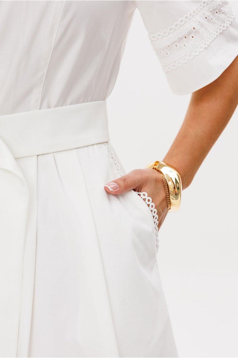 Платье полуприлегающего силуэта, отрезное по линии талии, застежка центральная (обработана притачной планкой) на петли-пуговицы. Лиф переда с фигурными рельефами. По линии талии в нижней части расположены складки. Лиф спинки с талиевыми вытачками, рукав одношовный втачной, слегка расклешенный. По нижней части спинки, рукава и по кокетке переда вставлена декоративная ткань с отделочной тесьмой. Воротник рубашечного типа с отрезной стойкой. По краю воротника и краю карманов настрочена декоративная тесьма. Платье на подкладке. Дополнением служит пояс.