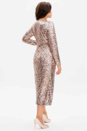 Платье полуприлегающего силуэта на подкладке, перед на запах со сборкой, спинка со среденим швом и талиевыми вытачками. Рукав втачной, одношовный.