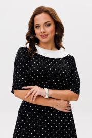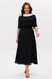 Платье полу прилегающего силуэта , расклешенное к низу, отрезное по линии талии со вставленным поясом на "венгерке". Рукав одношовный, втачной. Воротник плосколежащий, переходящий на спинке в рельефы, заканчивается бантом. Застежка на тесьму-молнию в среднем шве спинки до воротника.