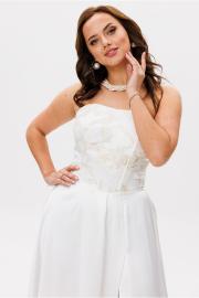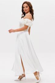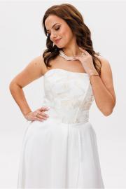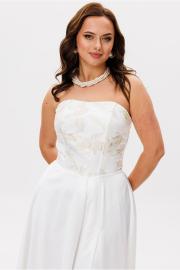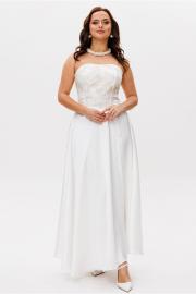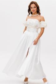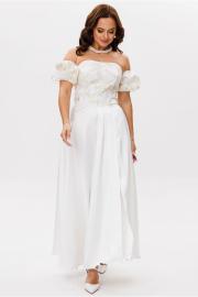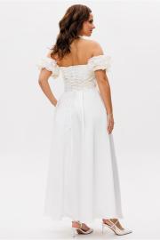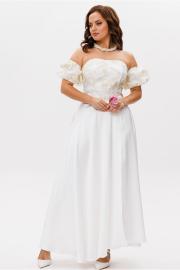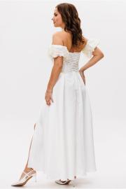 Платье женское приталенного силуэта, отрезное по линии талии. По лифу переда и спинки расположены рельефы. Юбка расклешенная с разрезом по переду. Застежка на потайную тесьму-молнию в среднем шве. Дополнительной застежкой служит шнуровка корсетного типа по спинке. Рукава съемные, держатся на резинке.