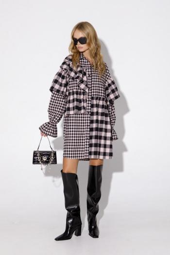 Платье женское полуприлегающего силуэта отрезное по линии талии. Лиф переда с нагрудными вытачками. Горловина V-образная. По среднему шву спинки сверху застёжка потайная молния. Юбка расклешённая. По линии талии эластичная тесьма резинка. Рукава одно шовные втачные. По окату рукава небольшие складки, низ со сборками. Украшает платье кружево. Изделие дополняет пояс кушак. Платье без подкладки.