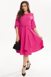 Платье женское полуприлегающего силуэта отрезное по линии талии. Лиф переда с нагрудными и талиевыми вытачками. Горловина круглая. По среднему шву спинки сверху застёжка потайная молния. Юбка расклешённая. Рукав одношовный втачной. Низ рукава со складками. Изделие дополняет пояс кушак. Платье без подкладки. Длина платья – 98,5см. Длина рукава-35см.