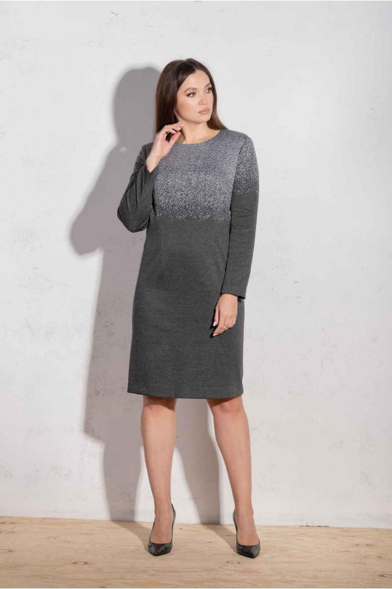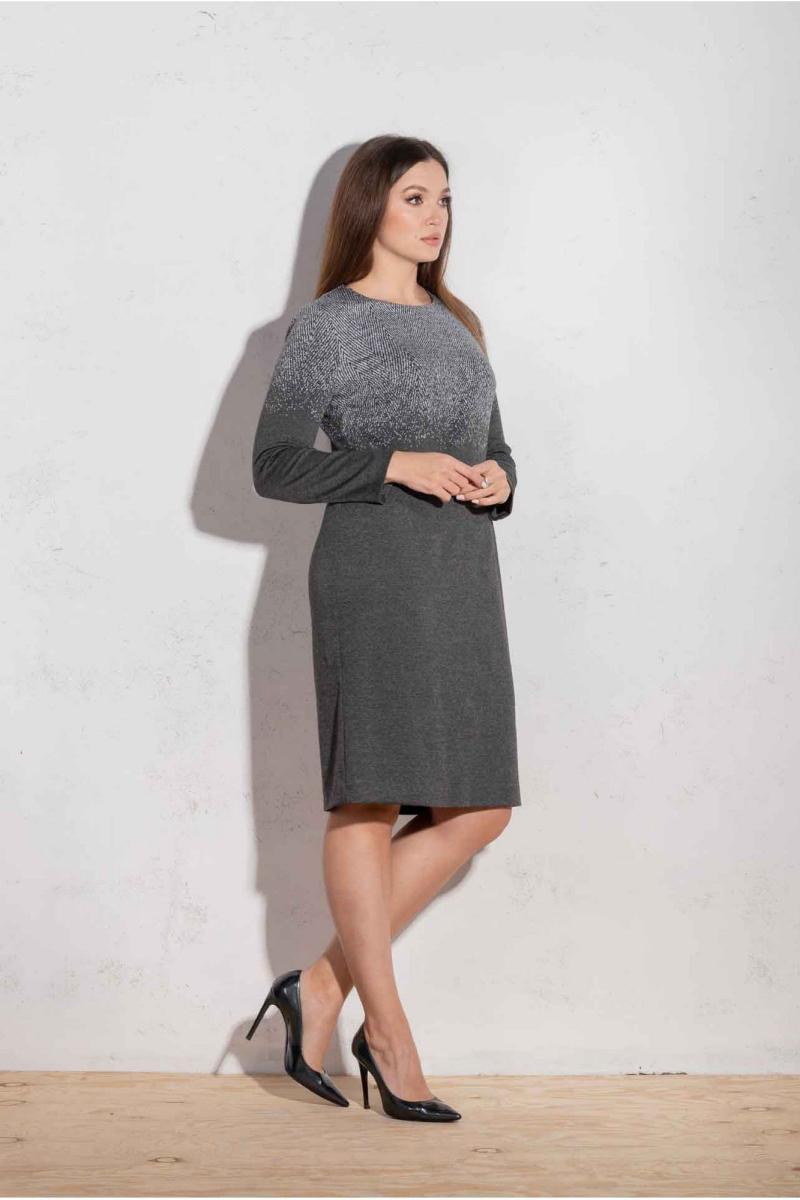 Платье женское полуприлегающего силуэта выполнено из трикотажного полотна. По переду нагрудные и талевые вытачки. Спинка с вытачками и застёжкой потайной молнией в центральном шве спинки, который заканчивается шлицей с разрезом. Горловина круглая. Рукава двух шовные втачные. Платье без подкладки.