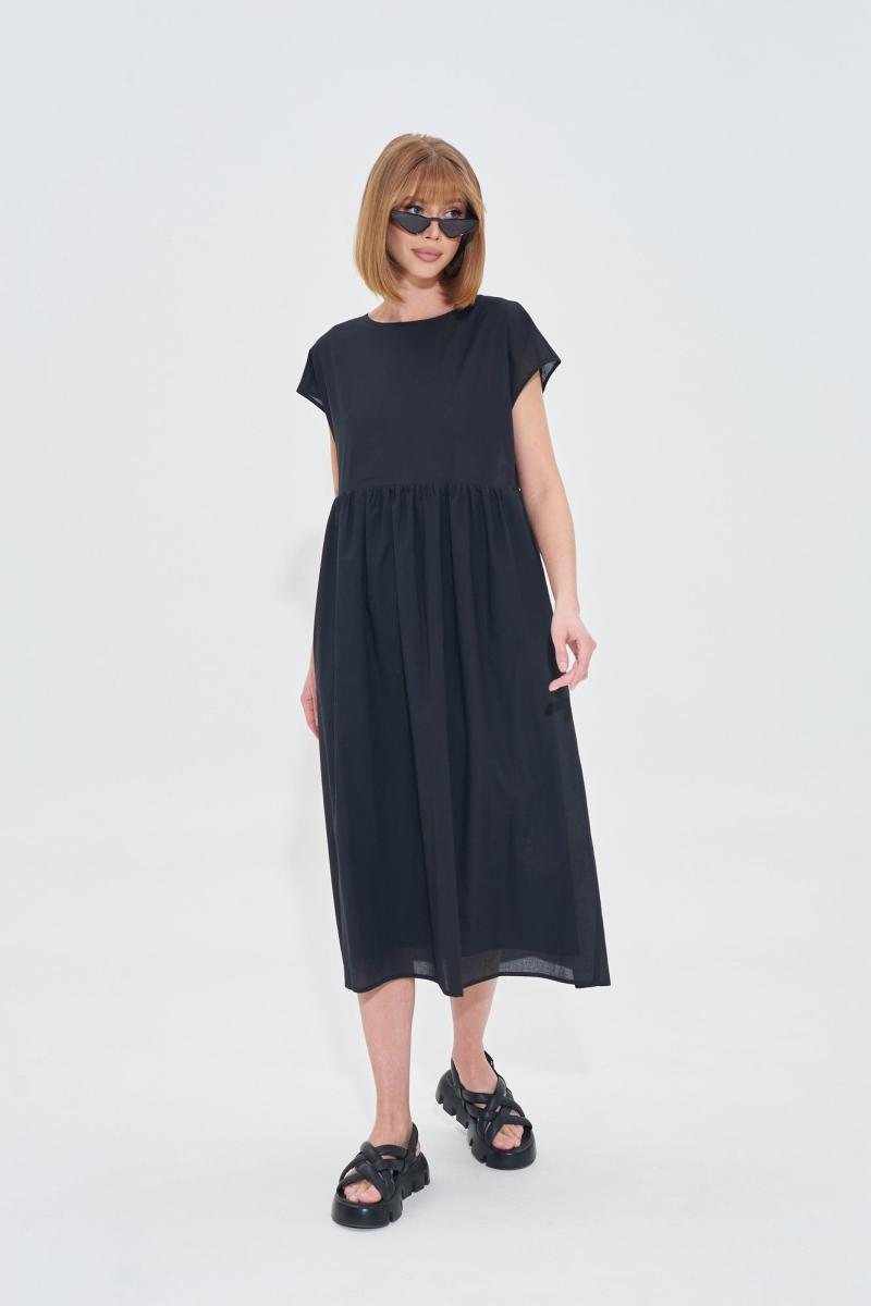 Платье свободного силуэта из легкой хлопковой ткани. На спинке планка с золотистыми пуговицами. Длина платья 120 см